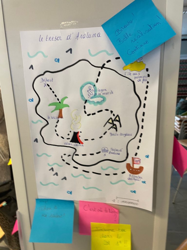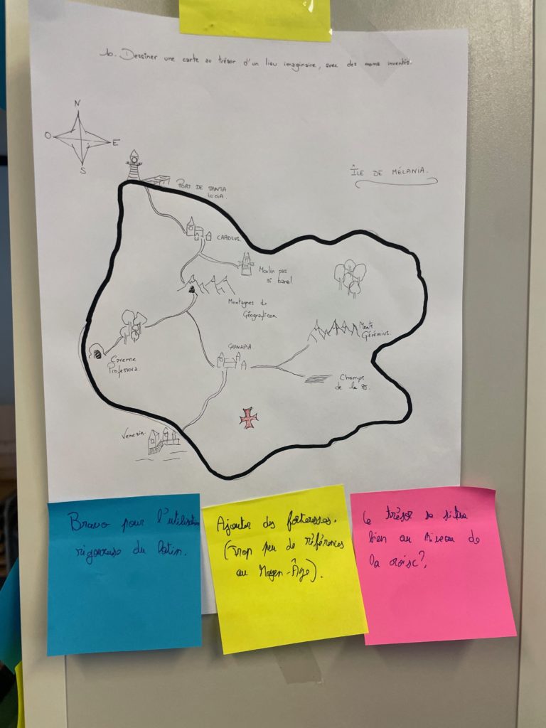 - Création individuelle : Chaque enseignant a choisi une tâche créative parmi une liste originale : dessiner une carte au trésor, inventer une loi fictive ou imaginer un slogan improbable.
